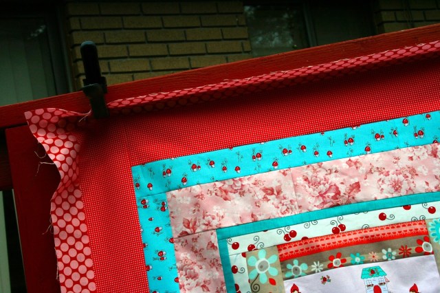 My ex husband’s niece is having a baby. She isn’t sure what the gender of the baby is yet, but every time I think of her and the pregnancy I see a little girl. I started this quilt with that instinct in mind. Inspired by this quilt by Malka Dubrawsky. Looking back and comparing the two, it seems hers has more layers but I’m still enjoying my version.